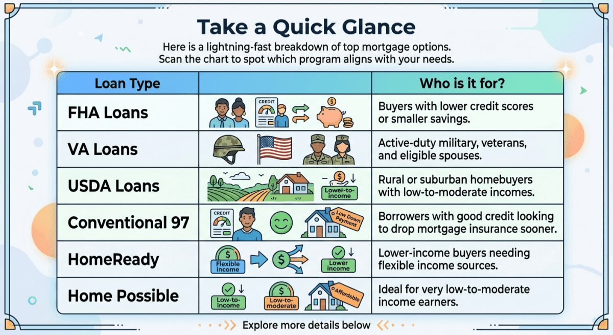 If you're short on time, here is a lightning-fast breakdown of the top mortgage options this year. I've put together this handy comparison table so you can instantly spot which program aligns with your current financial reality.