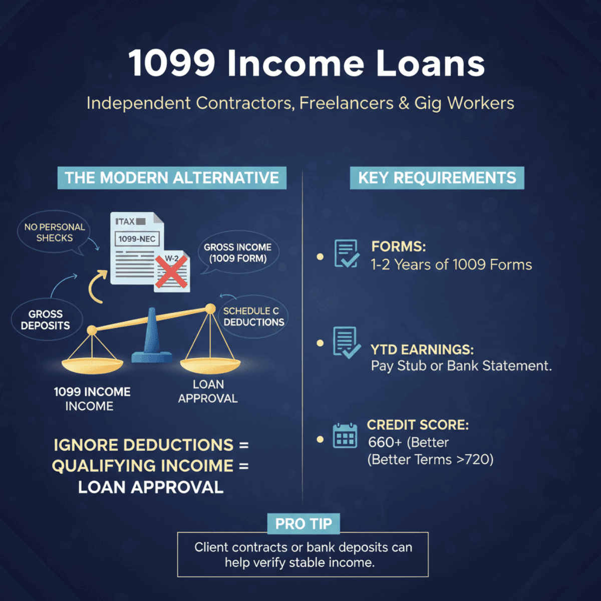 In the past, people might have referred to "NINJA" loans, but those risky products are largely extinct. The modern, responsible alternative for contract workers is the 1099 Income Loan. This is specifically designed for anyone who receives a Form 1099-NEC at the end of the year instead of a W-2. Similar to the bank statement loan, the lender looks at the Gross Income shown on your 1099 form. This is a massive advantage because it bypasses the heavy schedule C deductions that usually drag down your qualifying income on a standard mortgage application.