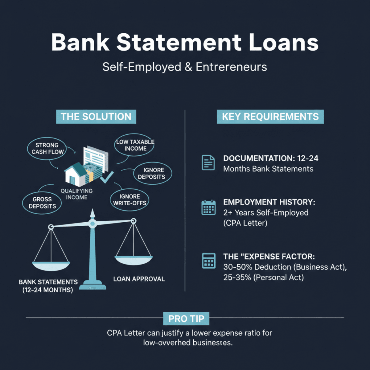 The "Expense Factor": Lenders typically apply a 30-50% deduction to gross deposits from business bank statements (often 40%) to estimate net income, or 25-35% for personal statements. A CPA letter can justify a lower ratio for low-overhead businesses.