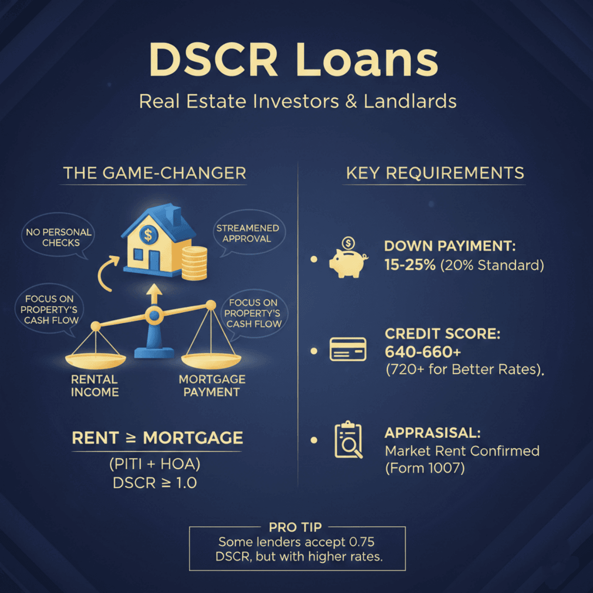 The Ratio Math: You typically need a DSCR ratio of 1.0 or higher. This means the monthly rental income must be equal to or greater than the monthly mortgage payment (including principal, interest, taxes, insurance, and HOA).