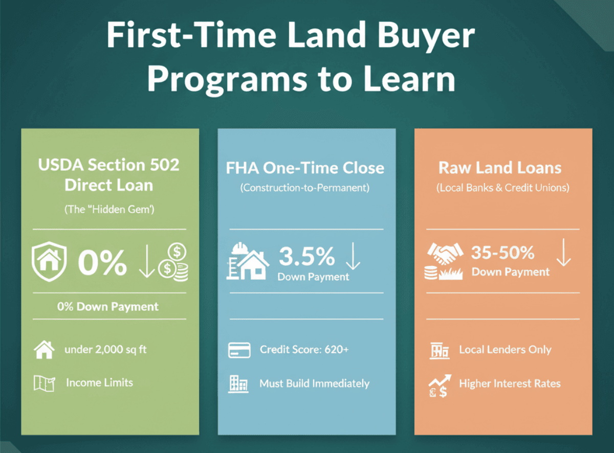 If you are looking in a rural area and have a low-to-moderate income, this is hands down the best program. The USDA Section 502 Direct Loan allows you to buy land and build a home with potentially 0% down payment.