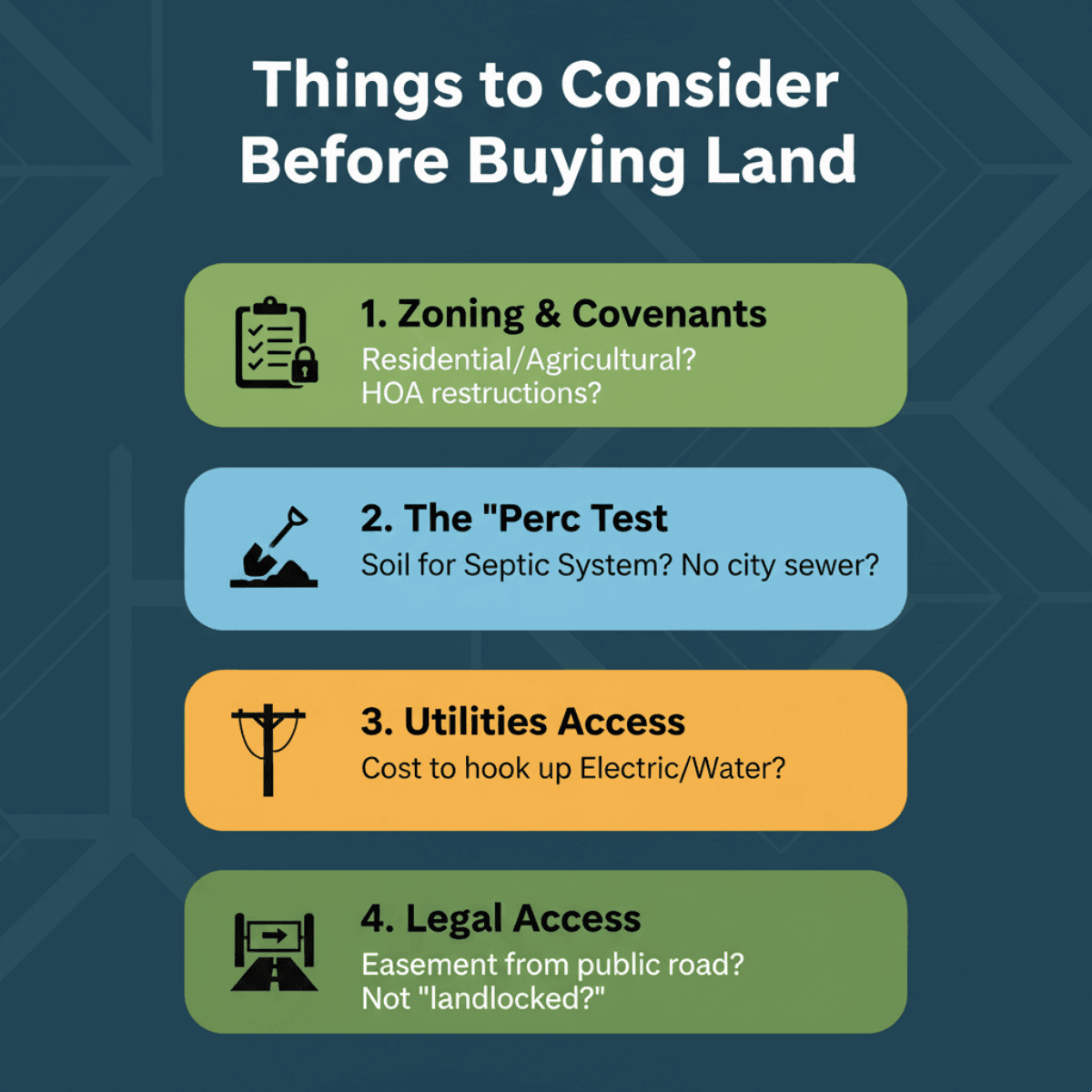 - Legal Access: Ensure the land isn't "landlocked." You must have a legal easement to drive from the public road to your property.
