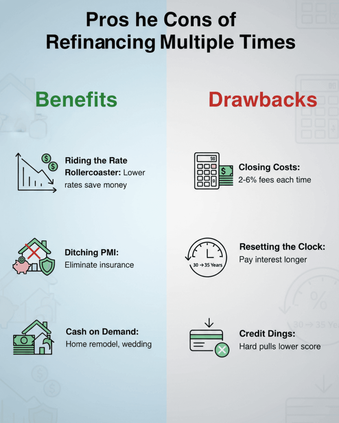 Closing Costs: This is the silent killer. Every time you refinance, you are paying 2% to 6% of the loan amount in fees. On a $400k home, that's serious money. Do that three times, and you've stripped a ton of equity out of your house.