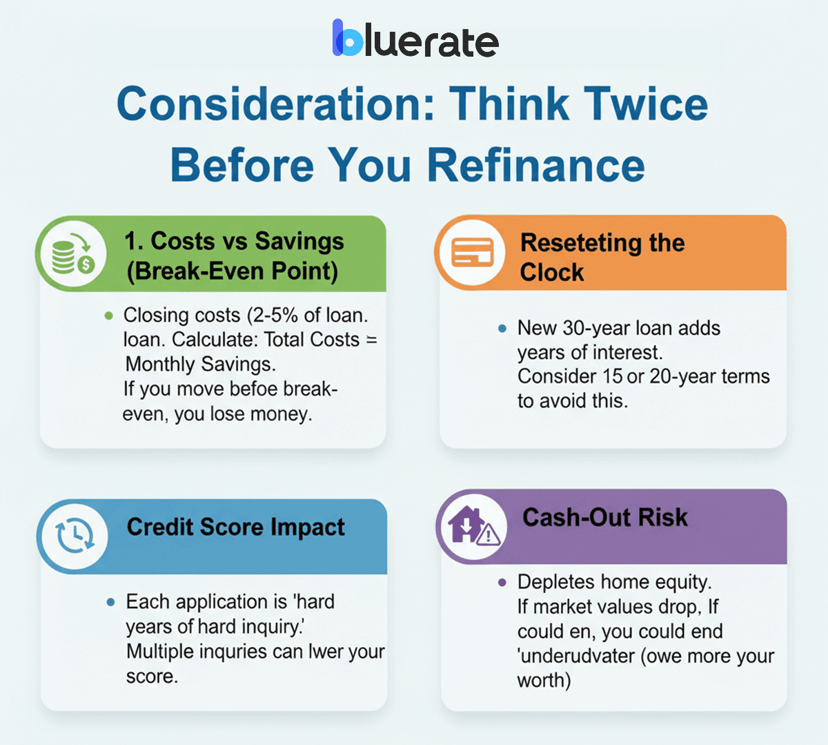 Refinancing isn't free. Closing costs typically run 2% to 5% of the loan amount. You need to calculate your Break-Even Point.