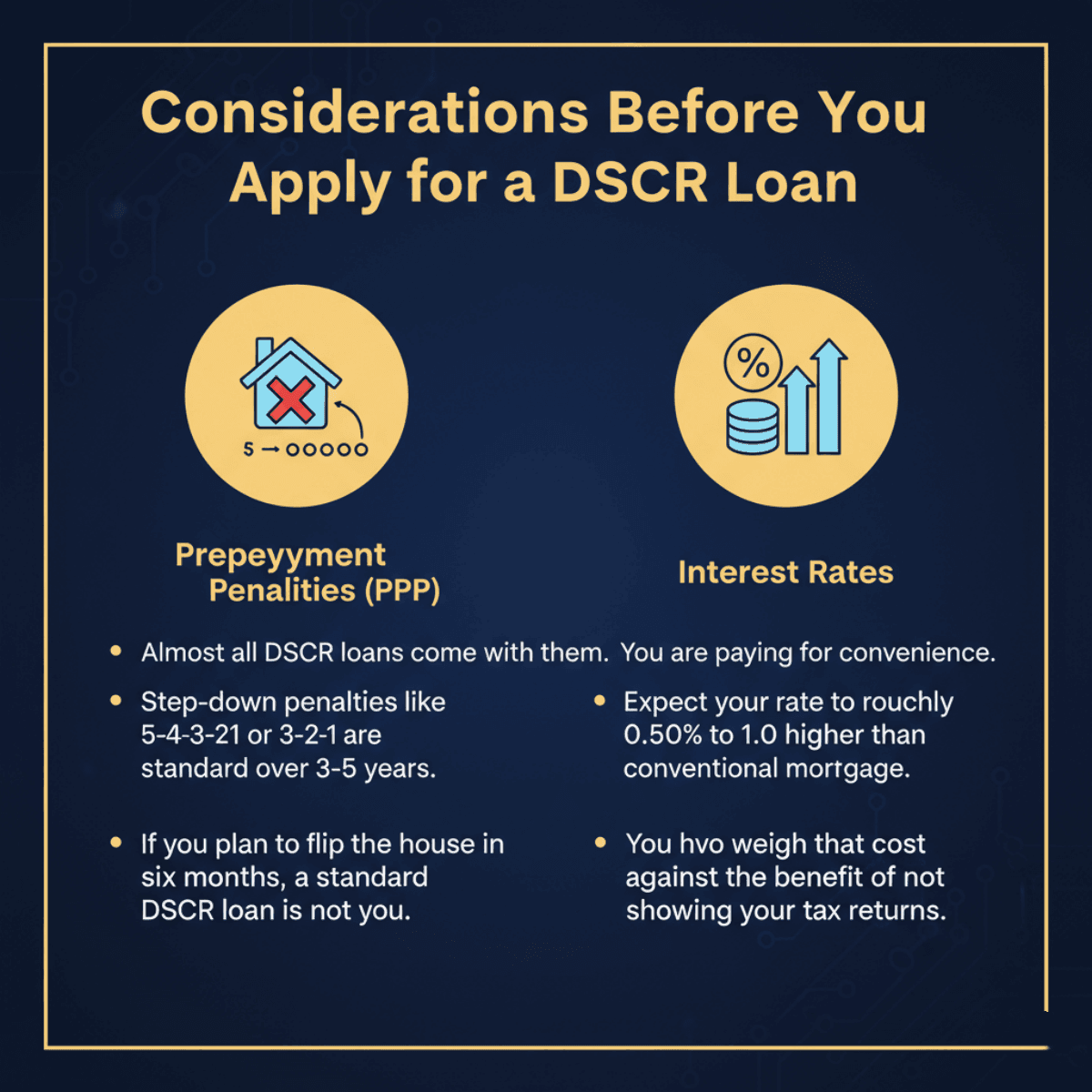 - Prepayment Penalties (PPP). Almost all DSCR loans come with them. Step-down penalties like 5-4-3-2-1 or 3-2-1 are standard over 3-5 years. If you plan to flip the house in six months, a standard DSCR loan is not for you.