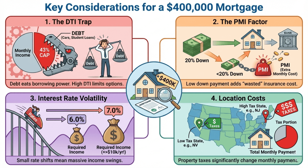 Interest Rate Volatility: In 2026, rates are still moving. A 1% shift might not sound like much, but on a $400k loan, it can swing your required income by over $10,000 a year.