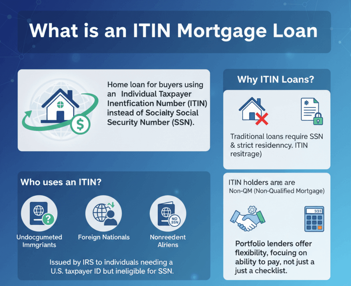 An ITIN Mortgage Loan is a type of home loan created for buyers who use an Individual Taxpayer Identification Number (ITIN) instead of a Social Security Number.
