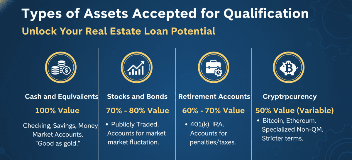 - Cash and Equivalents (100% Value): Money in checking, savings, and money market accounts is considered "good as gold." Lenders usually count 100% of these funds toward your qualification.
