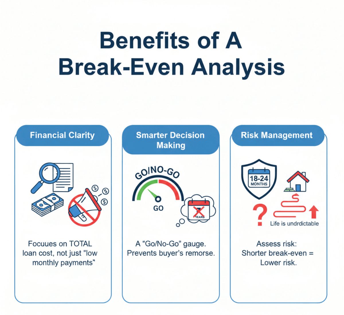 Risk Management: Life is unpredictable. Jobs change, and families grow. By knowing your break-even point, you can assess your risk. A shorter break-even, like 18 to 24 months, is low risk because it's easier to predict your life two years out than ten years out.