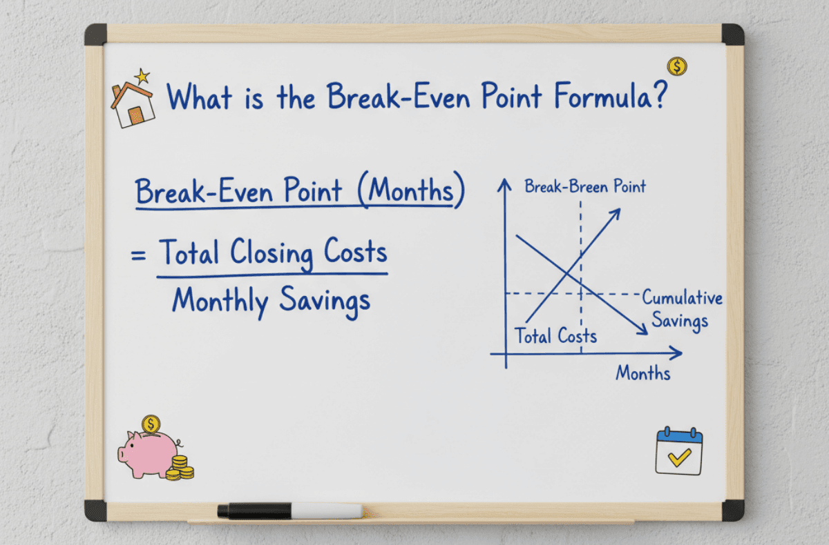 Break-Even Point (Months) = Total Closing Costs / Monthly Savings