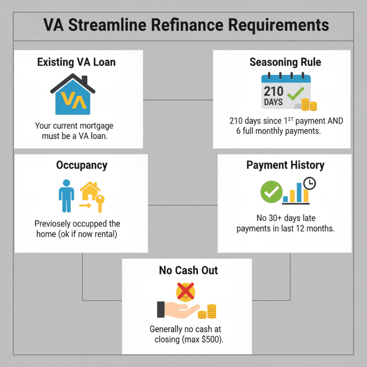 The Seasoning Rule (Crucial): This is where many people get rejected. You cannot refinance immediately. The VA requires that 210 days have passed since your first payment date, and you must have made 6 full monthly payments. Both conditions must be met.